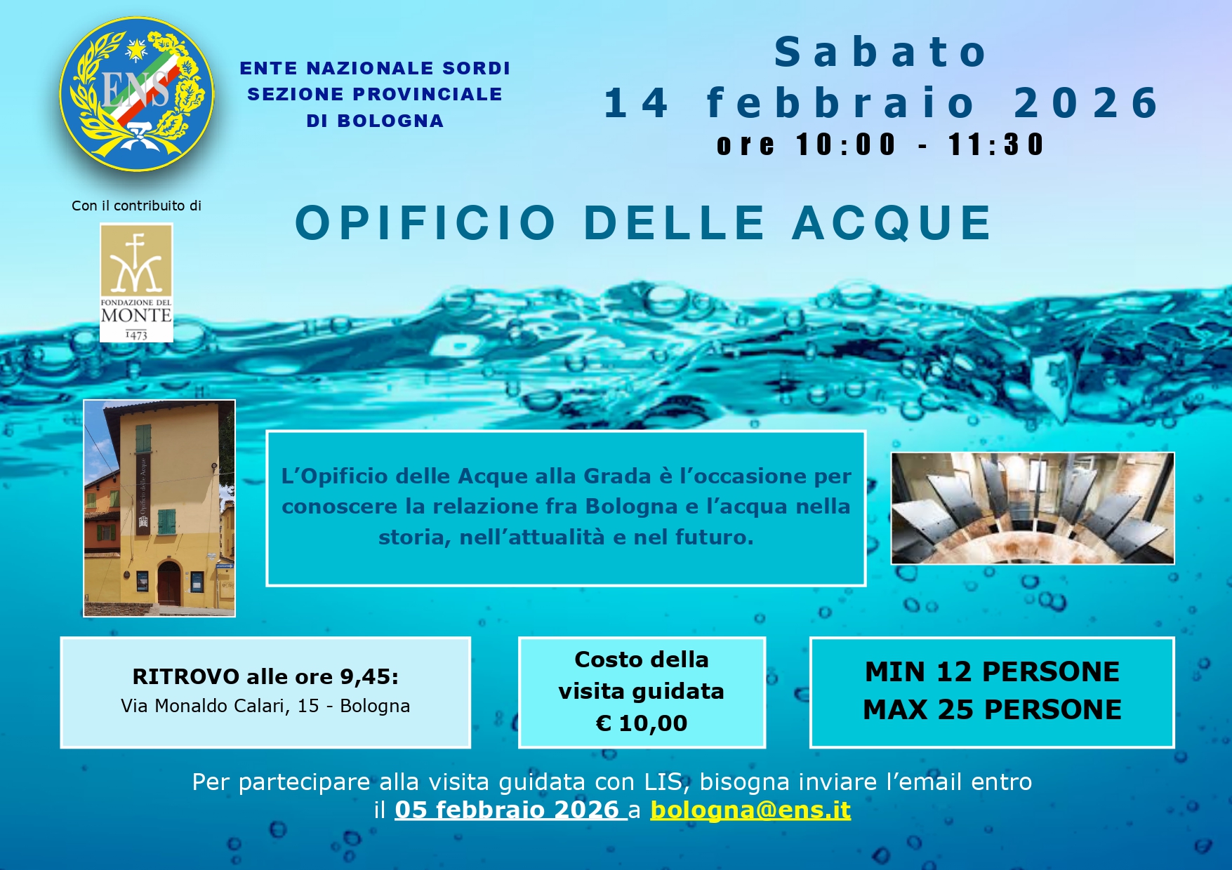 La Sede Provinciale ENS di Bologna ha organizzato una visita guidata con interprete LIS all' Opificio delle Acque a Bologna, il giorno sabato14 febbraio 2026.