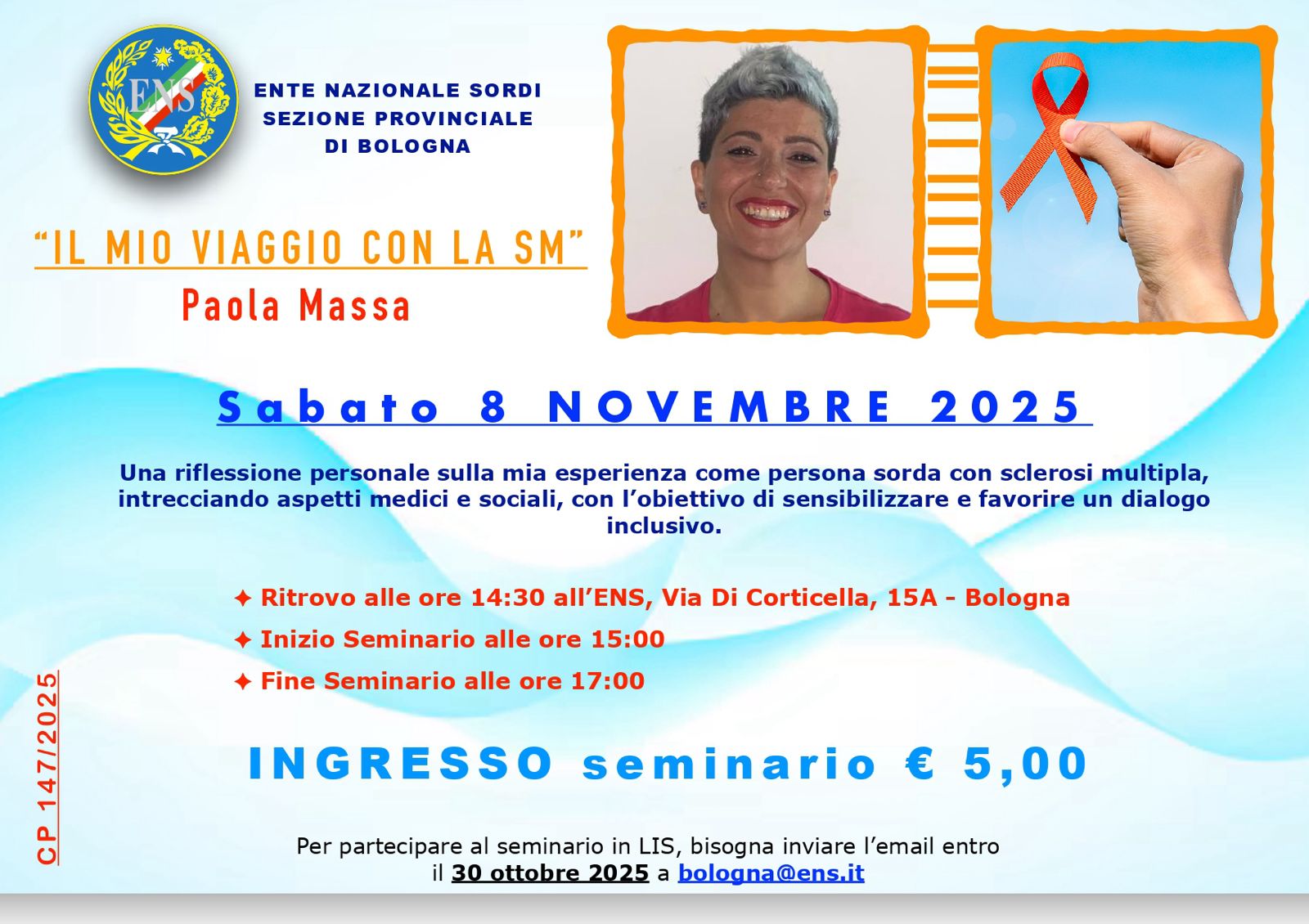 la Dott.ssa sorda Paola Massa sarà relatrice di un seminario molto coinvolgente sul tema "Il mio viaggio con la sclerosi multipla".